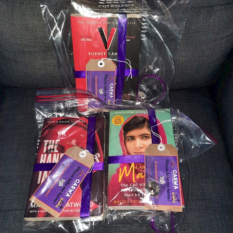 Throughout 16 days our team distributed over 25 books across Caithness and Sutherland for our book fairy project! We’re a team of readers and we picked out our favourite feminist and women-centred non-fiction and fiction literature to share with our community to raise awareness of feminism and women’s experiences. We added a sticker about the project inside all books as well as a bookmark and some CASWA goodies, tied the books in purple ribbon (CASWA’s branding colours) and popped a gift tag on the outside to explain what it was all about. However we couldn’t pop the book out like that - we are in Caithness and Sutherland and believe it or not we’ve had not one but two storms in the last 16 days! Weather-proof zip lock bags to the rescue!!!